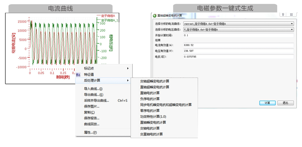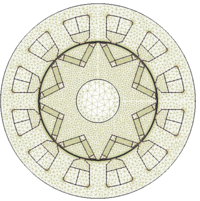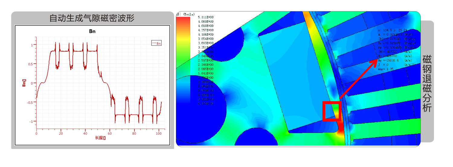 基子EasiMotor的电机设计分析,首先,根据设计指标和应用场合通过磁路法(场路镇合算法)完成电磁方案的初步设计,借助参数化设计功能完成方案优化。其次,通过电磁场有限元准确分析电机磁场分布、磁场谐波、绕组电感、漏磁系数等电磁参数,进一步优化磁路结构。最后,结合控制算法,通过虚拟试验平台模拟电机性能测试试验和故障检测试验,如起动过程、额定运行、过载运行、负载突变运行以及堵转试验、三相短路试验等。同时,结合损耗数据、材料、结构等,通过热网络计算电机温升,确保其运行可靠性;借助软件强大的脚本功能,依据磁场谐波分析和电磁力频谱从根源上解决电机电磁振动噪声问题。