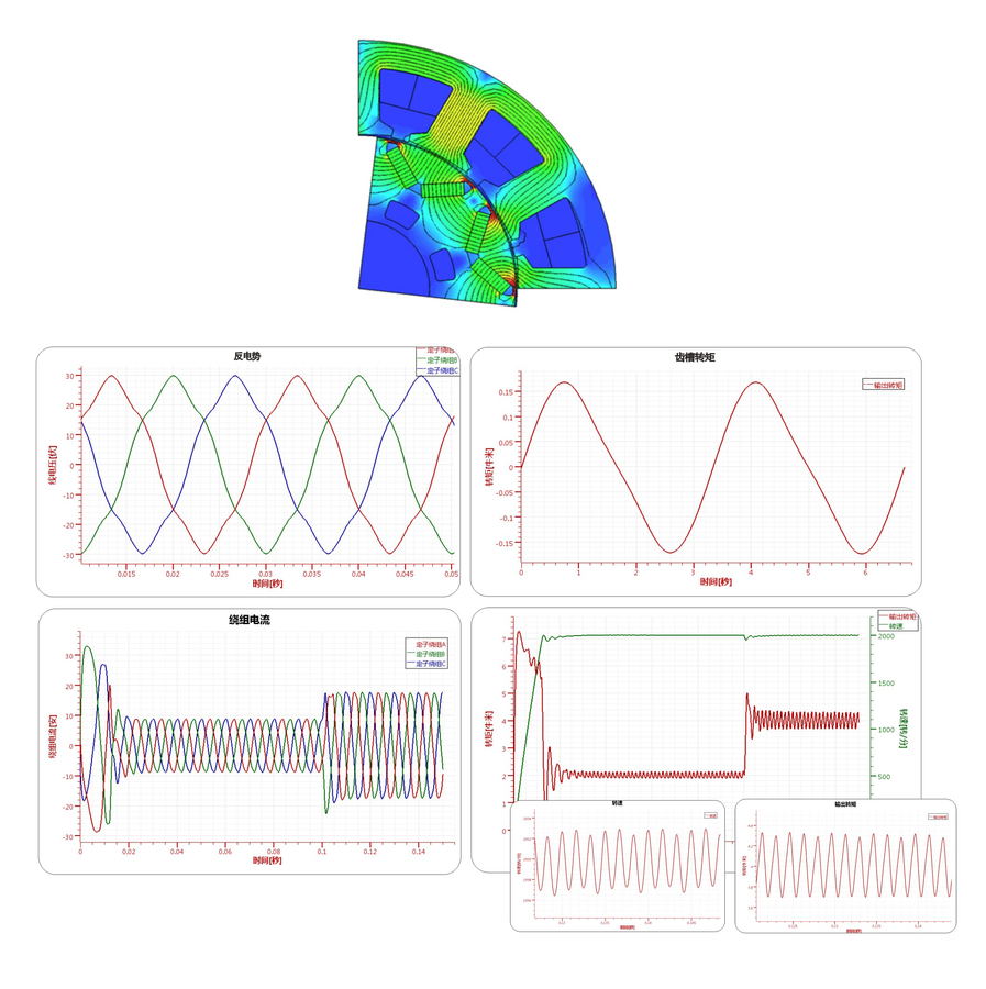 本例采用电磁场有限元模型与外部控制算法相结合的方法来模拟某3kW永磁同步电机的样机测试试验,计算电机齿槽转矩、反电势等空载特性,分析电机电流波形、转速波动、转矩脉动等瞬态性能,综合评估电机电磁方案。